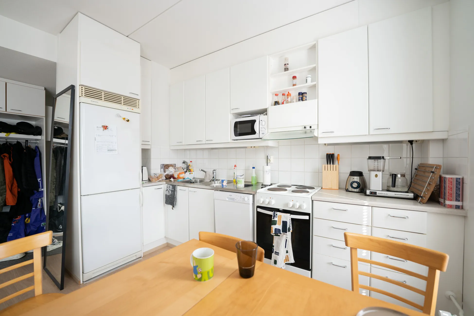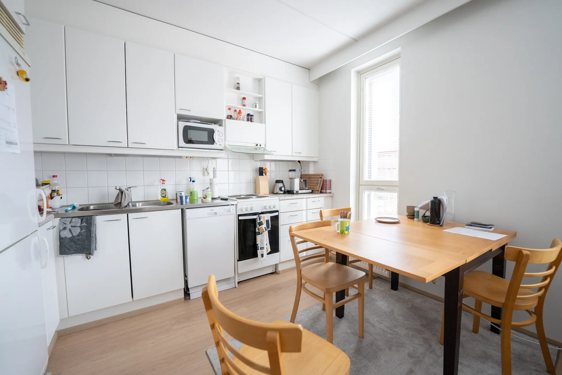 Ikkunallisessa tupakeittiössä runsaasti kaappi- ja laskutilaa sekä hyvin tilaa pöydälle . Myös mikrolle oma hylly.